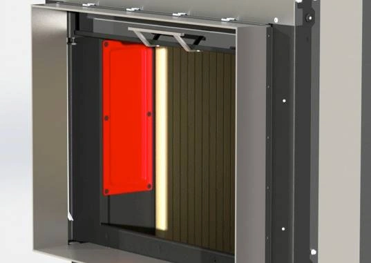 La focarele Hoxter cu usa glisanta, in timpul deschiderii usa este mai intai impinsa putin catre exterior pentru a preveni deteriorarea sistemului de etansare a usii. La inchidere, usa este trasa mecanic pe camera de ardere cu ajutorul a 4 rulmenti pentru a garanta etanseitate maxima.
