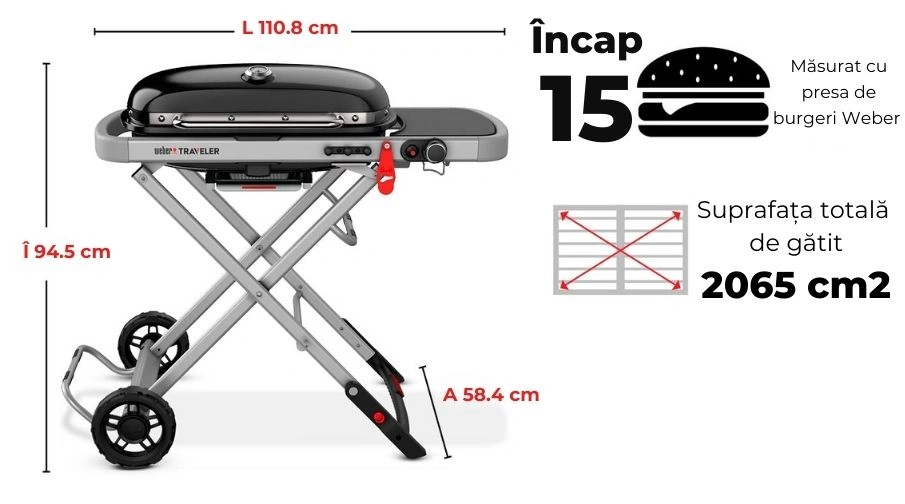 Gratar pe gaz Weber Traveler Stealth Edition, portabil si pliabil, cu suport pe roti, masa laterala si spatiu pentru butelie. Ideal pentru curte, balcon sau camping.