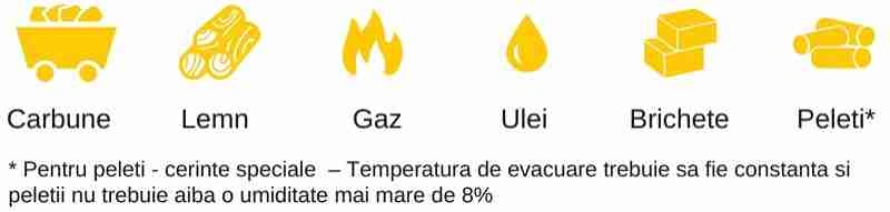 | Tip combustibil | Pelet (A1, ENplus) Lemn esenta tare (umiditate max ≤ 20%) GAZ (Butelie) Carbune Gaz Brichete Ulei |