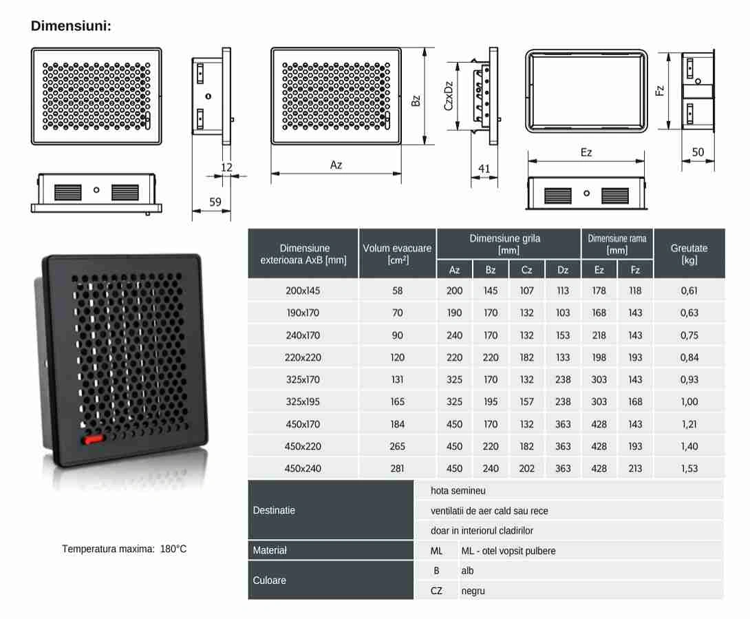Se foloseste pentru aerisirea si ventilarea hotei semineului in mod obligatoriu la sistemele de incalzire prin convectie pentru racirea camerei de ardere, avand si o functie estetica, pentru distributia aerului cald in alte incaperi, pentru accesul interior la termoseminee sau focare pe peleti sau pentru alte aplicatii de ventilatie (camara, beci, subsol, admisie aer, ventilatie casa, etc...)